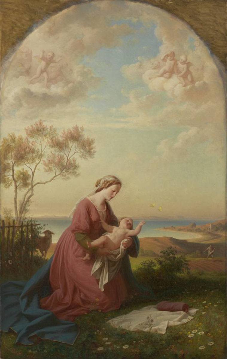 This is the only painting by Neureuther in this room not based on a work of literature. The picture of the young Mary kneeling on the ground while she holds her child recalls the type of Italian Renaissance image of the Virgin and Child known as the `Madonna of Humility¿. Both landscape and figure are southern in style, while the delicate colours are reminiscent of pastel.