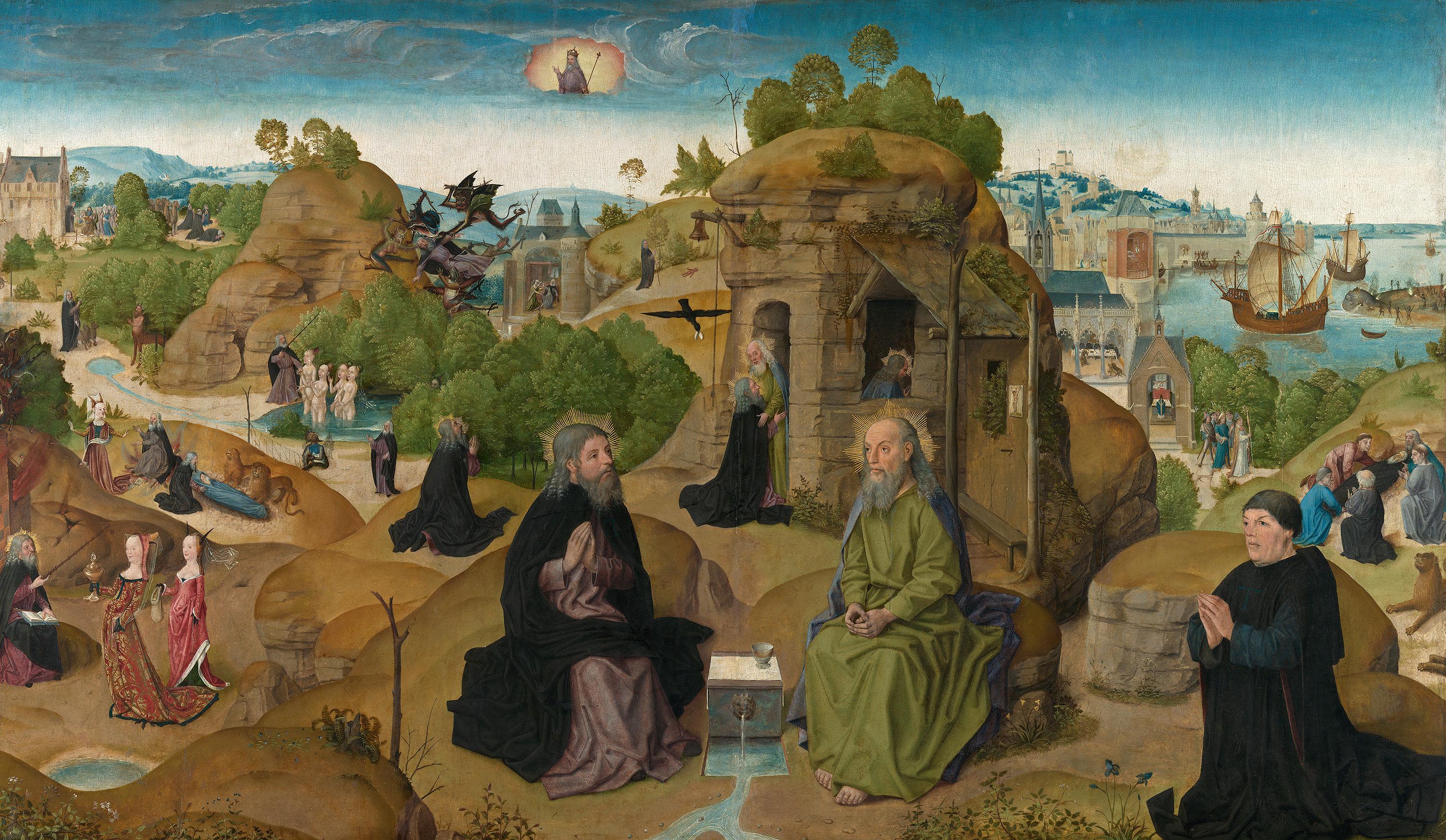 The meeting with Paul of Thebes forms the centre of this painting: the hermits, sitting outside Paul’s cell next to the water fount, are brought bread by a raven. To the left and right in the background are seldom-depicted scenes from the legends of the two saints, including various ‘Temptations of St Anthony’. The Antonines of Cologne, for whom this panel was created, will have instructed the artist. The preceptor, Wenceslaus Ulner, in office between 1493 and 1518, is probably the donor kneeling on the right.