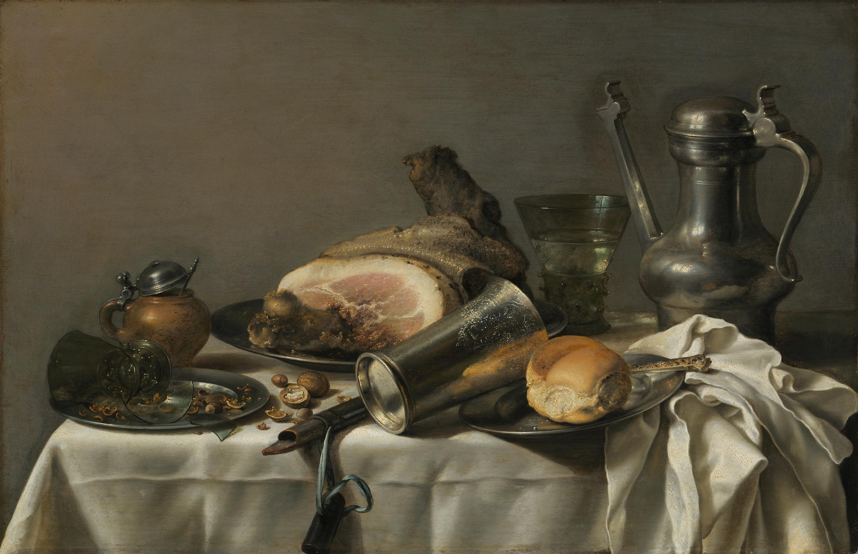 The still lifes with snacks produced in Haarlem from the midtwenties are also called “monochrome banketjes” because their color scheme (gray, green or brown) is coordinated to one, basic tone. Disorder and leftover food remind us of the inevitable passage of time.