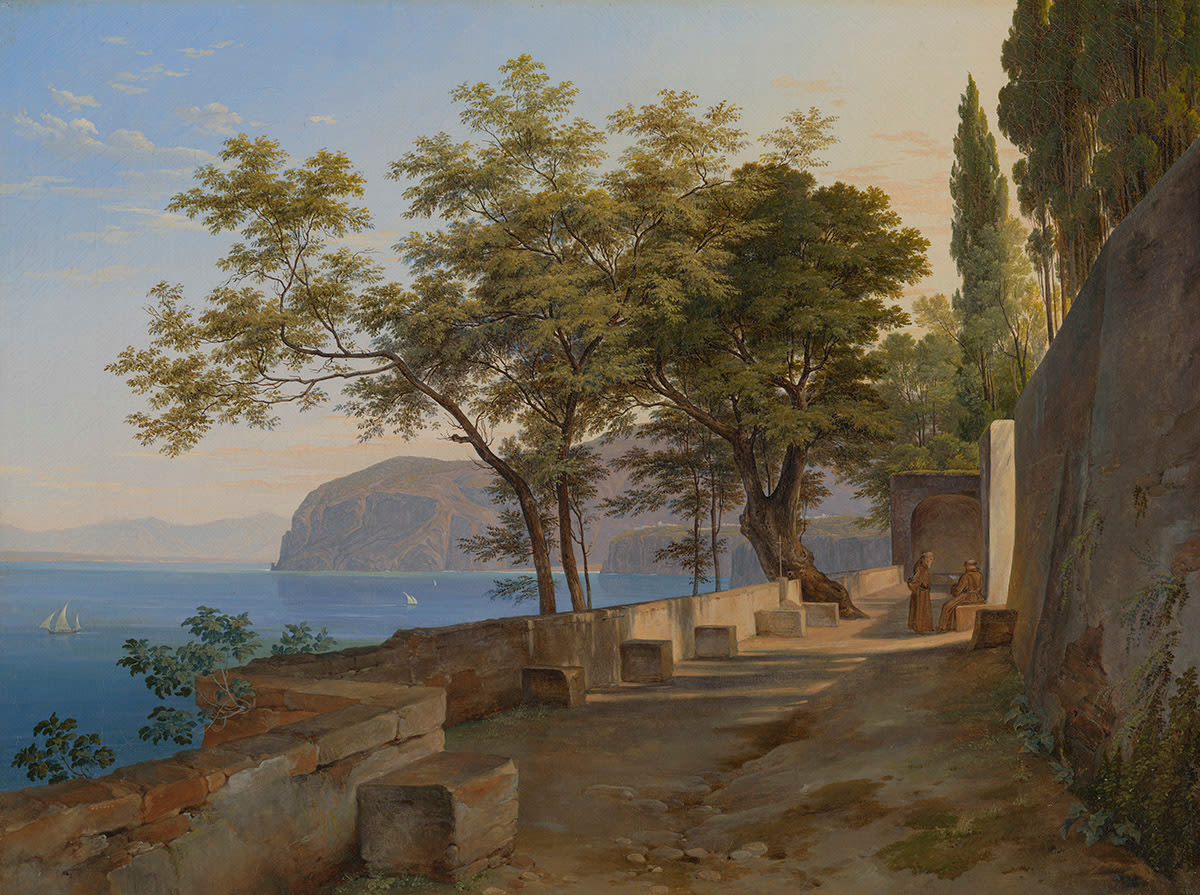 This small oil painting is based on studies, which Reinhold executed while on a trip to the Gulf of Naples in 1823 and shows a view from the terrace of a capuchin garden that lies directly on the water. The artist has composed the scene - popular among young German painters - skillfully through an intelligent choice of locale. Through the use of a diagonally placed wall in the left lower corner, which runs to the right and is intersected by the terrace and sea, a strong depth effect is established. In the rear of the terrace a few monks have been placed as staffage figures.