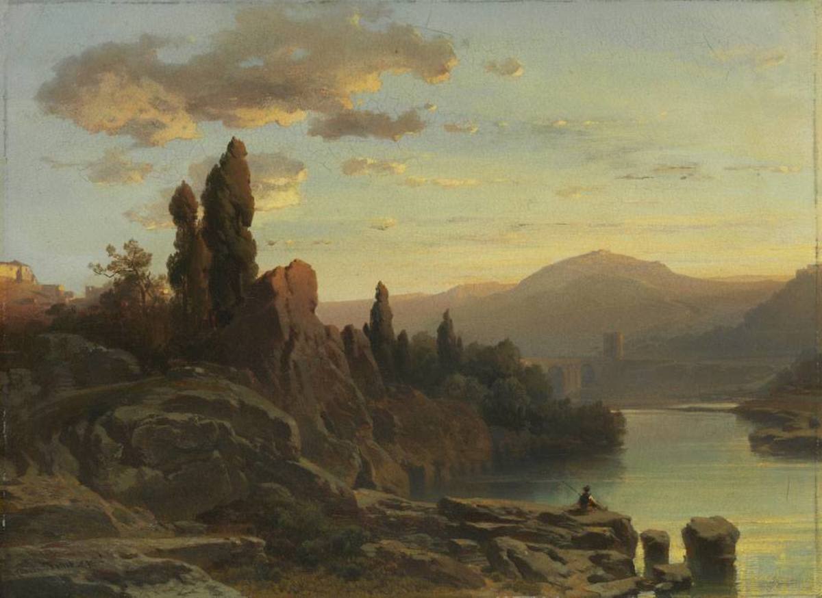 Toledo is the former capital of Castile and the seat of the archbishop who is Primate of Spain. Bamberger visited the city during his stays in Spain in 1850 and 1857. On these trips he made drawings that he later worked up into paintings in his Munich studio. This example shows an extensive view down the Tajo valley towards the bridge of San Martin next to the city.
