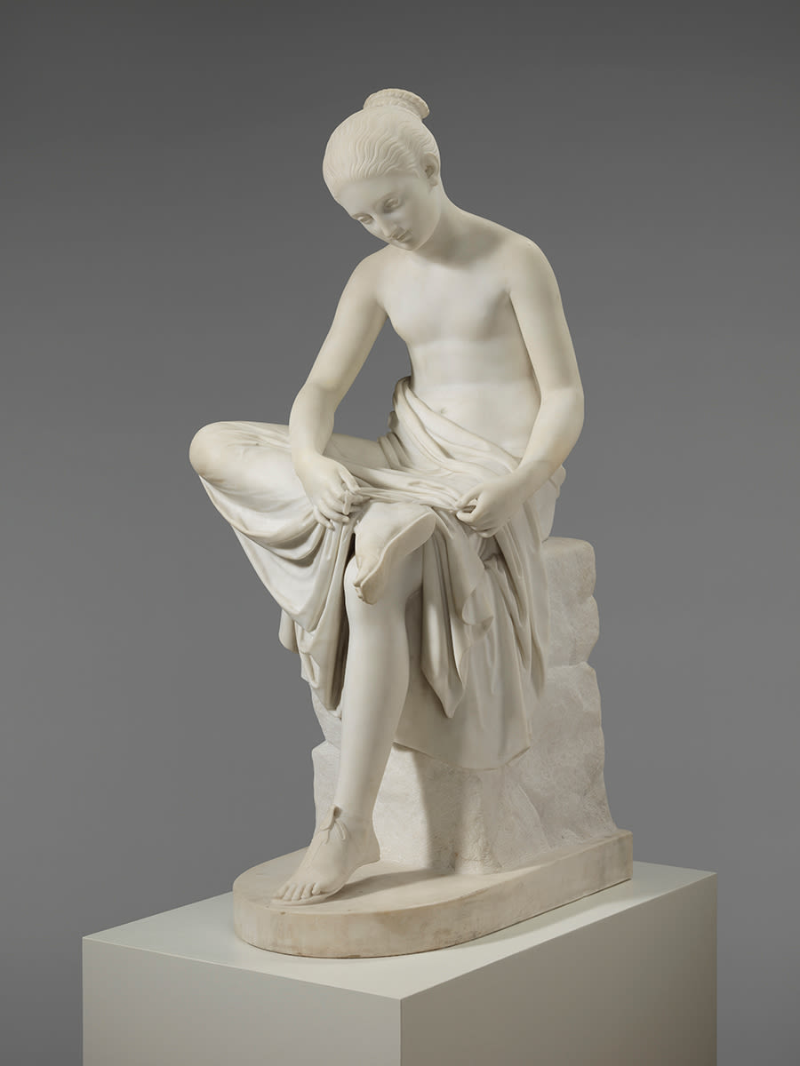 "Woman Tying Her Sandal", an almost life-size sculpture, is a replica commissioned in 1817 by Crown Prince Ludwig after Schadow's own original from 1813. The sculpture shows a young woman who is sitting on a stone block in order to tie the sandal on her right foot. She is simply clad with a cloth that is fixed around her waist, so that her child-like, somewhat thin upper body is exposed.