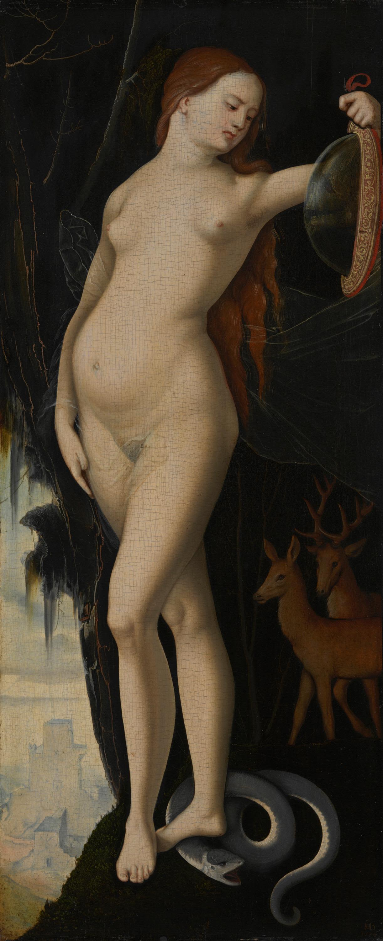 The meaning of the ‘Woman with Music Book, Gamba and Cat’ and the ‘Woman with Mirror, Serpent, Stag and Dog’ remains unsolved to this day. It is presumed that they are personifications from the complex humanist world of thought. Attempts to classify them have included Musica and Prudentia, the Temperaments, planetary deities, the Virtues, the Liberal Arts, or else they have been placed in a Christian context. The two paintings were probably part of a series.