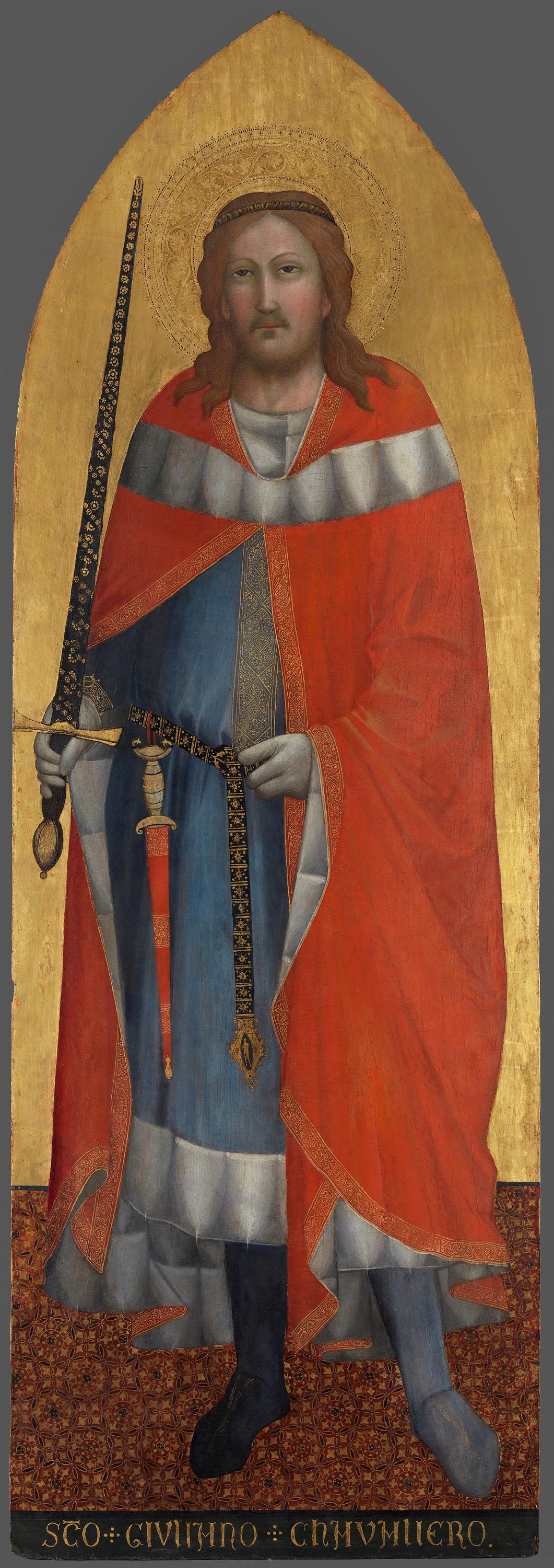 These panels (see inv. no. 7818, 7818a, 7818b, 7819a and 7819b) probably come from a two-winged altarpiece that is considered one of the most outstanding accomplishments in the field of Florentine painting due to its exceptional dimensions alone. It is not known where it was originally displayed. While the golden ground holds the figures on a flat plane, the soft modelling of the robes already suggests a greater three-dimensional quality and spatial depth. The high quality of the painting can also be seen in the details of the motifs such as the ornamentation on the hem of the dalmatic worn by St Nicholas and the Venus pudica figure on St Julian’s waistband. The benefactor, portrayed kneeling and turned to the right, would originally have been looking towards the central panel that no longer exists and that very probably depicted the Virgin and Child. Agnolo was Taddeo Gaddi’s son and the last representative of this important Florentine dynasty of painters.