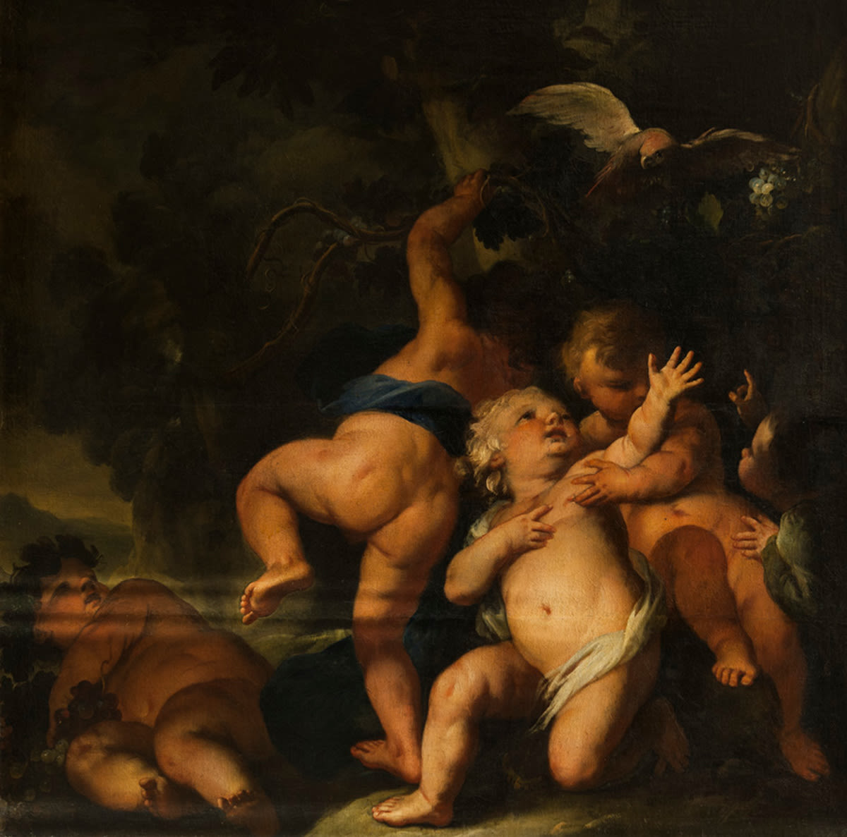 Fünf spielende Kinder mit Weinlaub und Papagei,