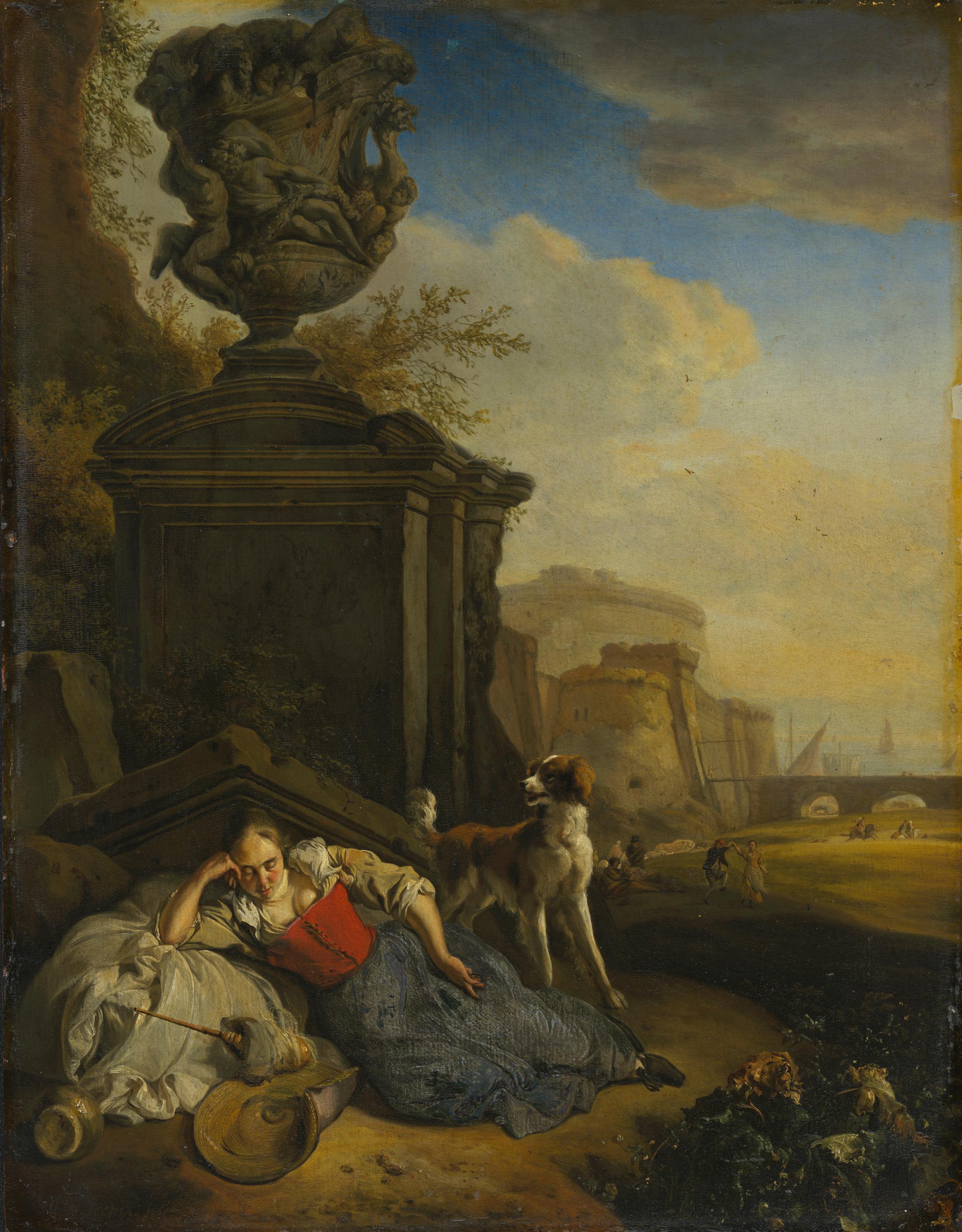 The hardworking and virtuous hunter (see inv. no. 248), returning home with plenty of game, is moralizingly juxtaposed with the lax idleness of the sleeping woman. After 1680 Weenix specialised in animal and hunt still lifes. From 1702 onwards he was in the service of the Elector of Düsseldorf Johann Wilhelm.