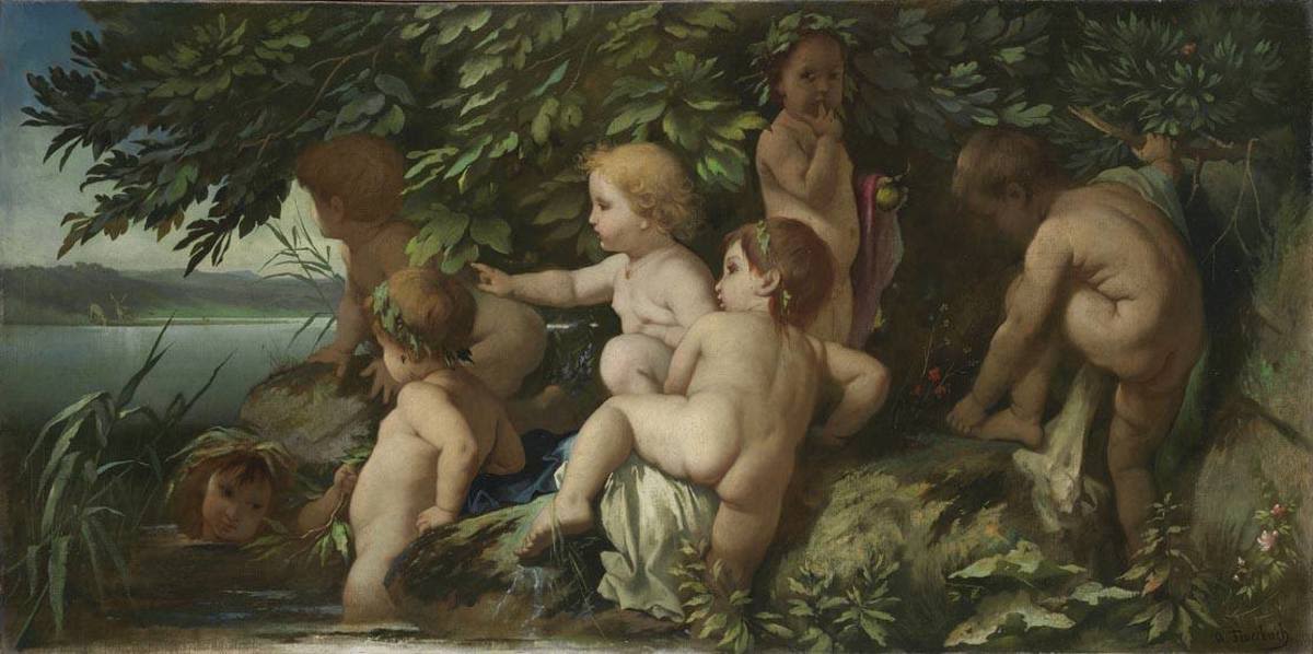 Feuerbach admired Rubens’s depictions of children, which showed how even the smallest paintings could achieve a monumental effect. This picture draws on imagery relating to the cults of Dionysus and Bacchus in classical mythology. Feuerbach painted a number of similar pictures featuring putti or children, their carefree play in natural surroundings embodying a yearning for humanity to be at one with creation.