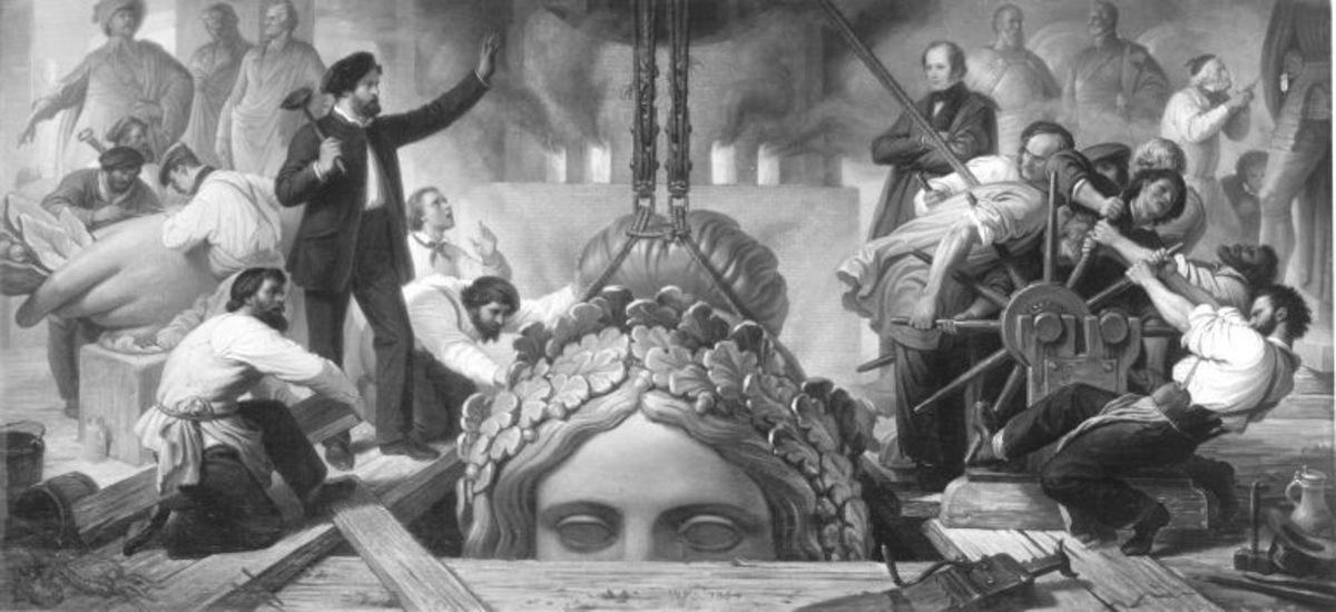Wilhelm von Kaulbach, Die Erzgießerei in München: Das Personal ist beschäftigt, das kolossale Haupt der Bavaria aus der Gußgrube emporzuwinden, 1854, Bayerische Staatsgemäldesammlungen – Neue Pinakothek, URL: