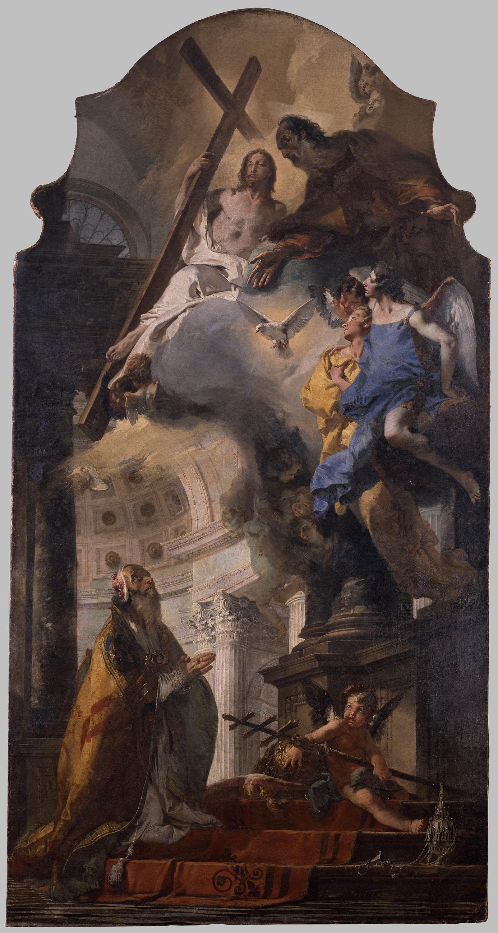 The archbishop and elector Clemens August of Cologne, the brother of the Bavarian elector, commissioned this work from Tiepolo in Venice. This altarpiece, intended for the Church of the Canonesses Regular in the north wing of Nymphenburg Palace, depicts Pope Clement, the benefactor’s namesake, who held office in the first century. With an esprit of his very own and the intelligence of the artist’s narrative prowess, Tiepolo paints a dramatic version of the Holy Trinity, accompanied by angels, experienced in a vision by the pope at the altar of a Baroque basilica.