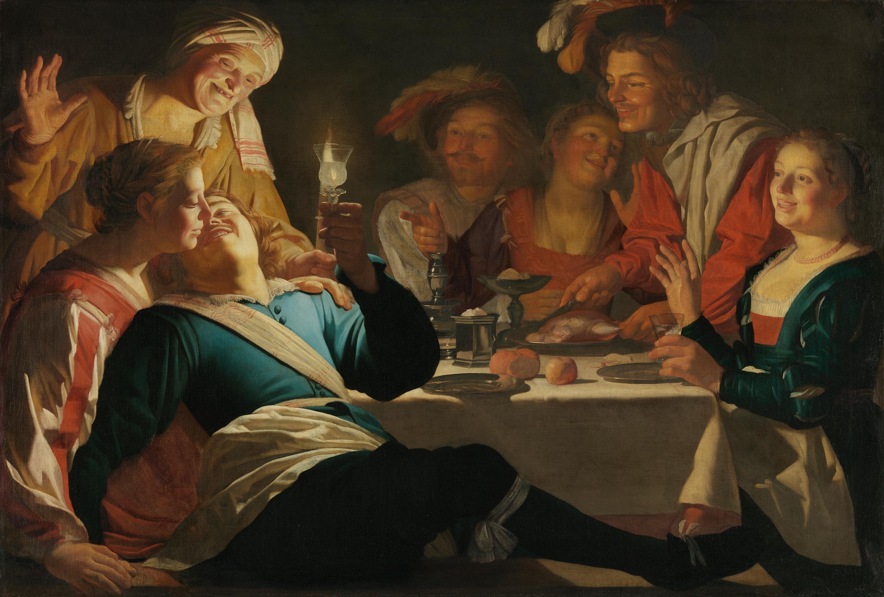 Van Honthorst is one of the many early seventeenth-century painters who were influenced by Caravaggio. His night scenes are known for their skillful depiction of the effects of warm candlelight. Here, three cavaliers in a brothel have abandoned themselves to food, wine, and the pretty courtesans. An old procuress has joined the group around the table and shows her approval. The moralising message takes second place to the lively goings-on.