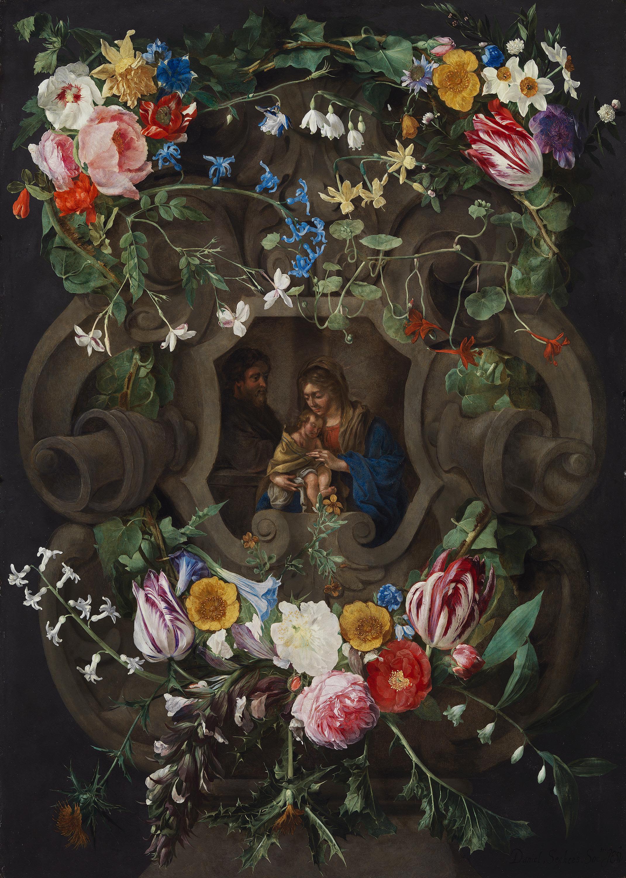 The depiction of religious scenes as a picture within a picture and surrounded by flowers reflects religious practices: to this day sacred pictures are decorated on special occasions with flowers as a sign of veneration. The famous flower painter Jan Brueghel the Elder collaborated with Peter Paul Rubens on such works; however, it was Daniel Seghers who surrounded sacred images with richly ornamented stone cartouches and then additionally with floral decoration. Here, too, the Holy Family was painted by another artist. The flowers are related to these figures: the rose is a common symbol of Mary, and the thistle refers to the Passion of Christ.