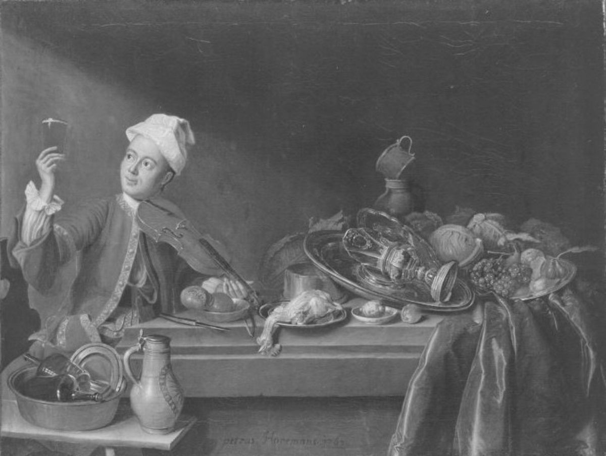 Peter Jacob Horemans, Stillleben mit Geigenspieler, 1763, Bayerische Staatsgemäldesammlungen – Alte Pinakothek, URL: